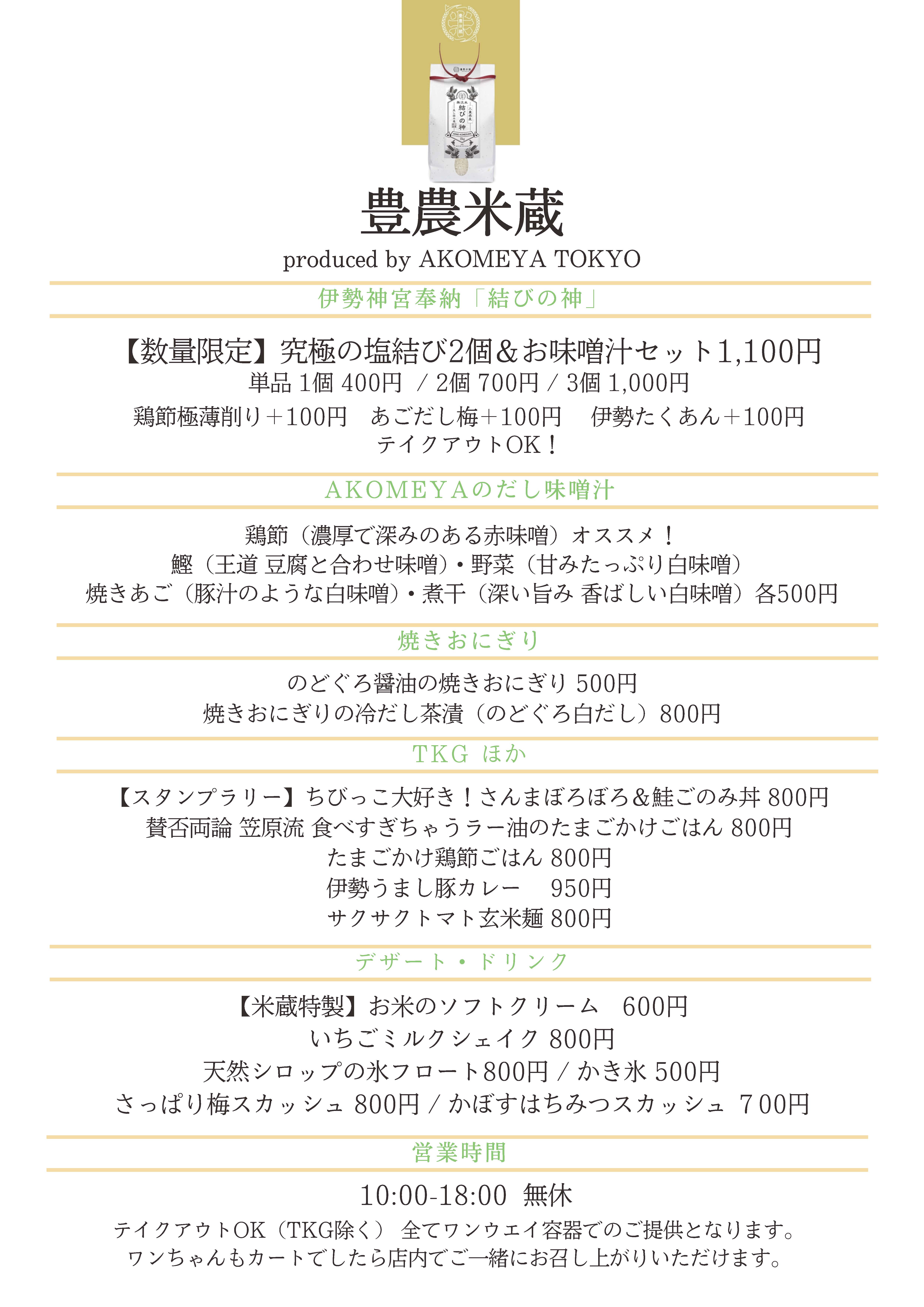 AKOMEYA TOKYO がプロデュースする「豊農米蔵」は、伊勢神宮奉納米「結びの神」をはじめ、選りすぐりのごはんのお供や雑貨を取り揃えたセレクトショップです。